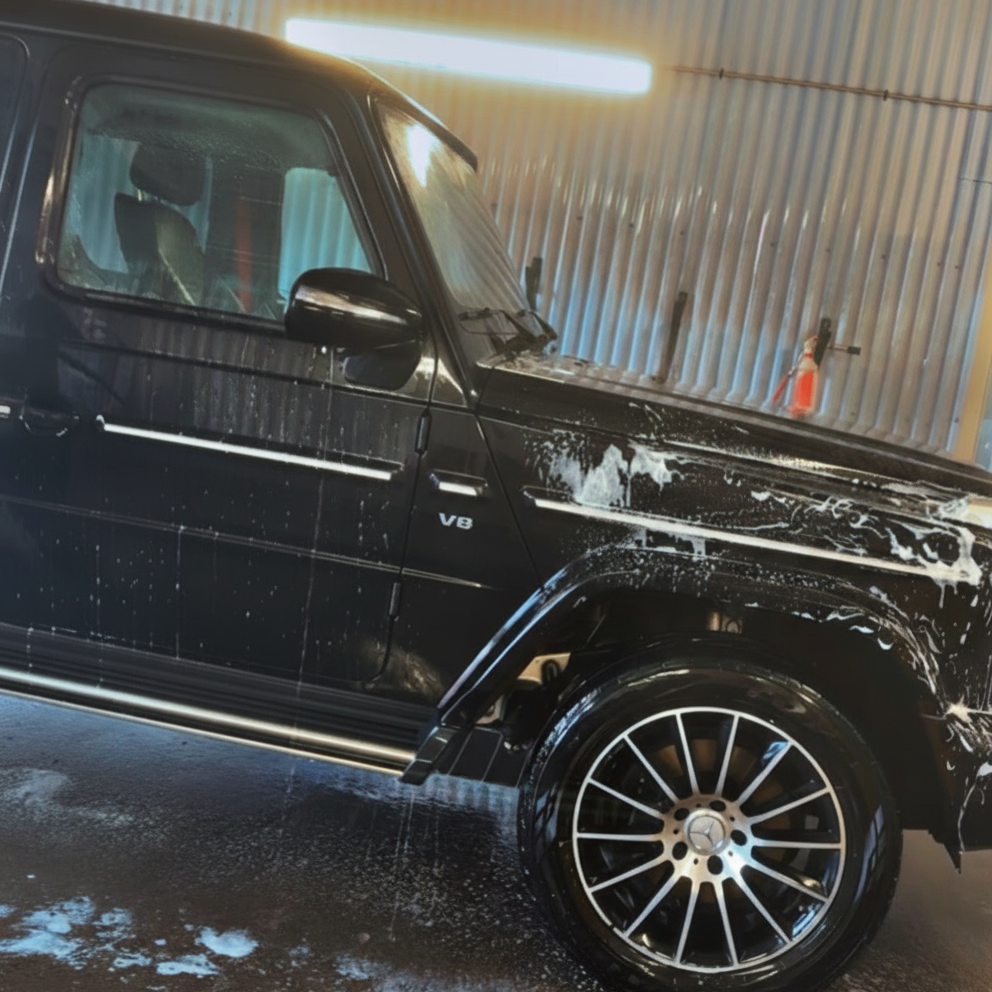 Utv.: Fjerning av asfalt og salt, fjerning av ferske insektsrester, grundig skånsom håndvask, underspylling, manuell rengjøring av felger, ekstra tørking, gummi fornyer på dekk.